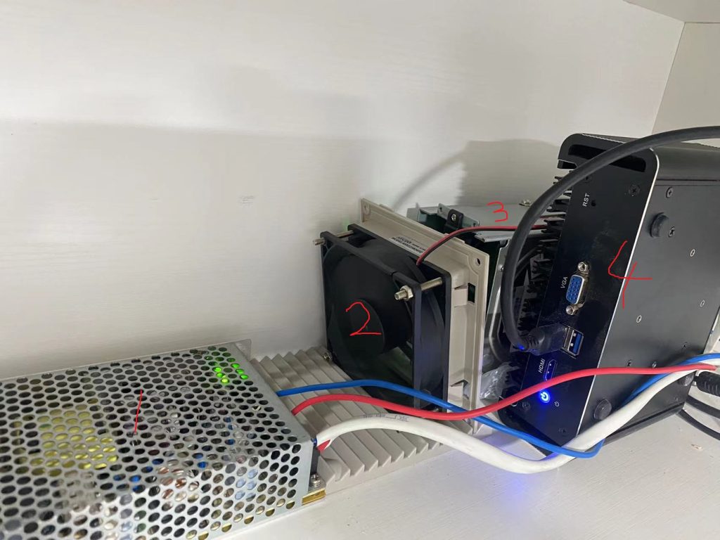 1号是一个工业电源,里面是220V输入,12V,24V输出,有没有5V我忘了。这个主要的作用就是给弱电箱散热,毕竟里面的软路由,硬盘盒子在夏天还是有点温度的。这个风扇是24V的,当初买的时候只考虑到大风量就选择了这个。转速好像有3000多,买回来后觉得噪音真的很大,就偷了个懒把风扇直接接到了12v上,这下噪音好多了。其实想把这个工业电源去掉直接家里的不用的12v的路由器电源就好懒得动手了。毕竟这个工业电源又丑又危险,生怕哪天不小心碰到了220上,所以当初安装的时候就装了个漏电保护器,这个非常有必要的。